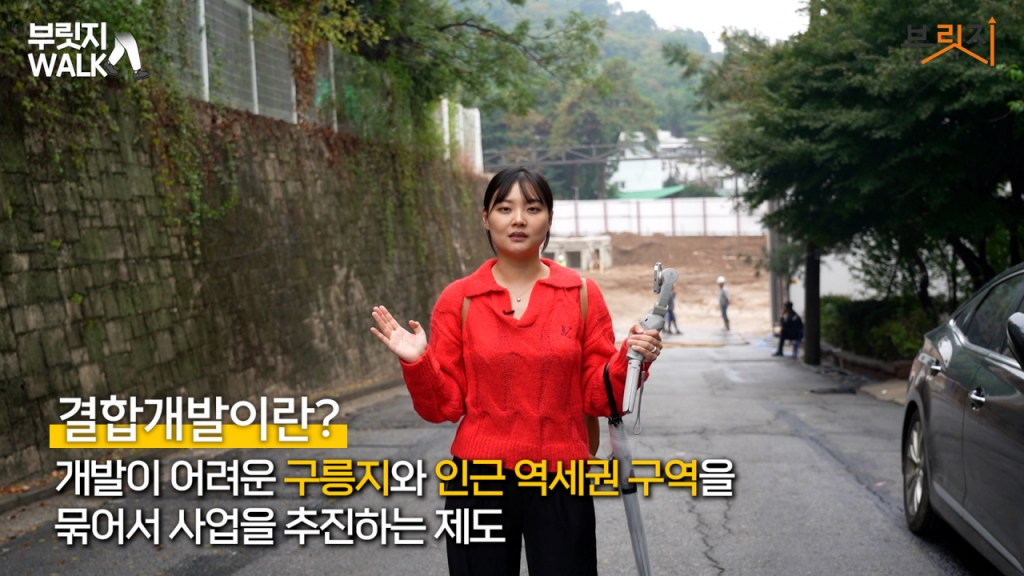 지금 열심히 땅을 고르고 있는 이곳이 아이파크자이 3단지가 들어서는 곳입니다. 같은 3구역으로 개발되는 곳인데 왜 이렇게 떨어져 있느냐. 이문3구역은 전국 최초의 결합개발지입니다. 결합개발은 이렇게 개발이 어려운 구릉지와 인근 역세권 구역을 묶어서 사업을 추진하는 제도인데요. 상대적으로 사업성이 떨어지는 지역을 같이 개발하면서 역세권 인근 단지에 용적률 인센티브를 주는 거죠. 그래서 아이파크자이가 역세권 고층 아파트 단지가 될 수 있었던 겁니다.