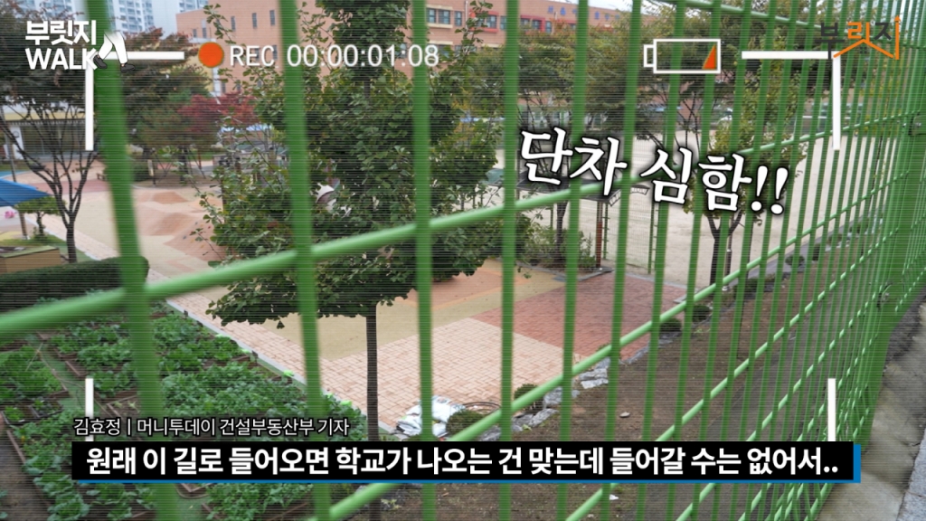 초등학교를 가고 있습니다. 1구역이든 3구역이든 가장 가까운 이문초등학교로 배정된다고 하거든요. 골목을 따라 이문초등학교에 왔는데 제가 온 길로 오면 단차 때문에 학교에 들어갈 수가 없네요. 정문은 두 블록 더 걸어가야 하거든요. 초등학생들이 다니기엔 거리가 좀 있겠어요.