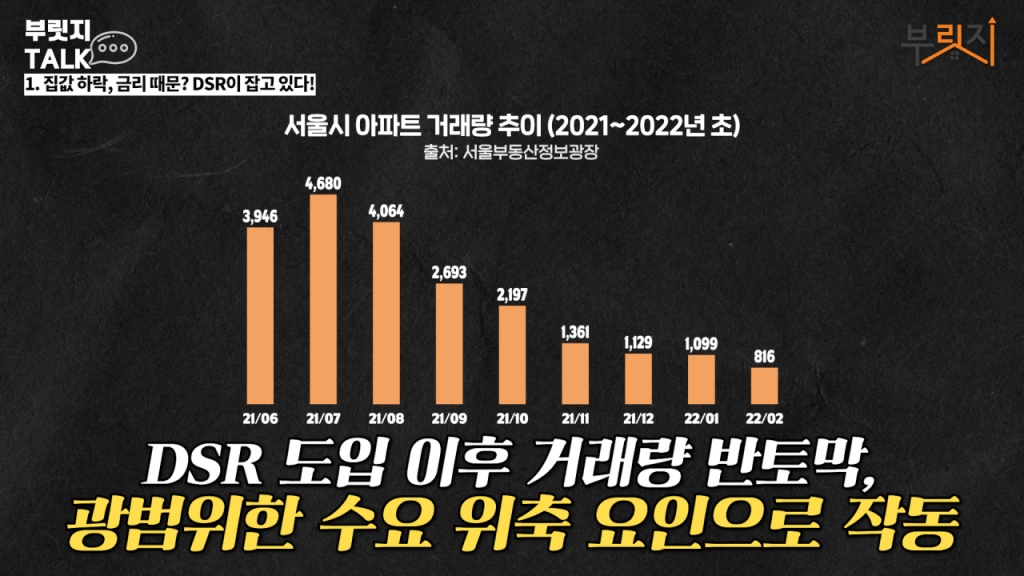 DSR은 말 그대로 자기 소득 대비해서 부채를 받을 수 있는 한도를 결정하는 건데 그게 40%로 세팅이 됐고 이게 도입된 게 지난해 1월부터였습니다. 아시겠지만 2021년 11월이 전고점이에요. 지난해 1월부터 거래량 급락이 나타났는데 사실 그때는 한국 기준으로는 금리를 올리지도 않을 때였거든요. 즉 2021년 12월과 다음 달인 지난해 1월에 달라진 건 오직 DSR밖에 없었는데 그것만으로도 거래량이 반토막 났기 때문에 DSR이 얼마나 광범위하게 수요 위축 요인으로 작동하는지는 이미 입증됐다고 생각하고요.