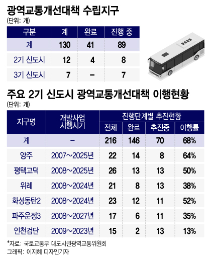 광역교통기금 도입 무산으로 신도시 교통난 해결은 더 먼일이 됐다. 현재 광역교통개선대책 사업이 수립된 지구는 화성 동탄 2지구, 평택 고덕지구, 파주 운정 3지구 등 모두 130곳이다. 전체 광역교통사업비는 약 30조원에 달하지만, 올해 상반기 기준 예산집행률은 67%(20조2000억원), 사업이행률은 31%다. 아직도 쓰지 않는 재원이 10조원가량 남아 있고, 교통사업이 완료되지 않은 사업장 10곳 중 7곳에 달한다.