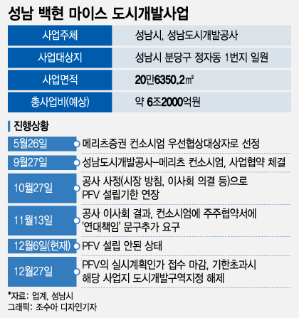 지난 9월27일 사업협약을 맺은 성도공과 메리츠증권 컨소시엄은 PFV(공사 지분 50%+1주, 컨소시엄 지분 50%-1주)를 세우고 성남시의 사업시행자 지정을 거쳐, 이달 27일까지 PFV가 실시계획인가를 접수해야 한다. 기한을 못지키지면 사업대상지의 도시개발구역지정이 해제돼 사업시행이 불가능해진다. 성도공이 신상진 성남시장의 방침과 이사회 개최 지연 등 내부사정을 이유로 PFV 설립을 미뤄오던 중 일방적 협약변경을 요청해 절차진행이 멈춘 상태다.