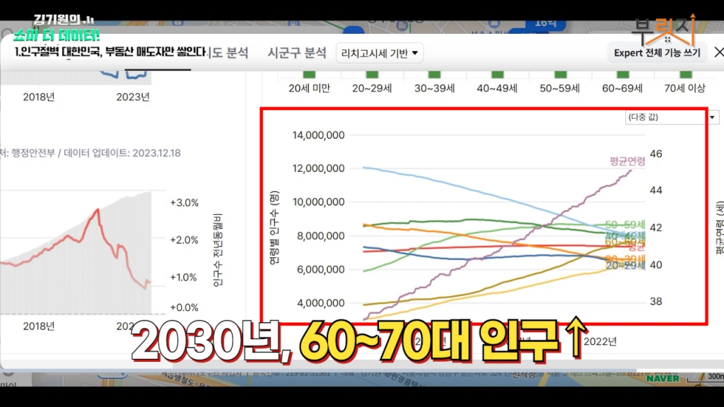 60대 이상의 인구는 주택의 수요자라기보다는 매물을 내놓는 매도자일 가능성이 커요. 결국은 젊은 사람들이 사줘야 하는데 지금 20대 줄어드는 거 보이세요? 그리고 이게 지금 모이고 있어요. 2030년대가 되면은 60대 70대 이상의 인구가 그 밑에 인구보다 많아집니다. 그리고 갈수록 줄어들어요. 일단 사람 자체도 줄어드는데 이 나이대별 인구 숫자가 완전히 지금 천지개벽이 일어나는 거예요. 인구가 계속 늘고 젊은 사람들이 많고 그만큼 수요는 많고 잠재적인 매도자는 없는 상황에서는 부동산 수십 년 동안 흔들흔들하면서도 우상향했던 게 맞습니다. 앞으로는 흔들흔들하면서 예전처럼 그런 우상향이 나올 가능성이 없습니다. 그렇기 때문에 부동산도 10년 20년 무조건 들고 간다는 저는 맞지 않다라고 봐요. 우리 2030 세대 분들은 이런 부분들을 명확하게 직시를 하시고 이런 당장의 달콤한 이런 정책들에 혹해서 그냥 2024년 초에 지르고 이런 거 하지 마세요.