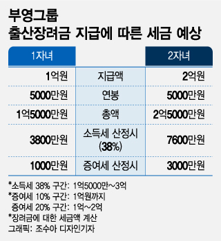 국가가 아닌 기업이 나서 현금 1억원을 지급하기로 결정했지만 세금 관련 걱정이 뒤따른다. 일단 부영은 직원들이 내야할 세금을 최소화하기 위해 근로소득이 아닌 직원 자녀에 대한 증여 방식으로 지급하기로 발표했다. 수령자가 증여세 10%인 1000만원만 내면 되기 때문이다.
