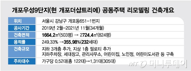 강남구 소재 개포더샵트리에는 리모델링 사업의 대표적인 성공 사례로 꼽힌다. 해당 단지는 1991년 준공된 232가구 개포 우성 9차 단지를 2021년 12월 리모델링한 곳이다. 시공은 포스코이앤씨가 맡았다. 기존 개포 우성 9단지의 용적률은 249.33%였다. 주변 개포 우성 3차(용적률 179%)와 경남아파트(174%) 에 비해 높았던 탓에 재건축 사업성이 충분치 않았다.