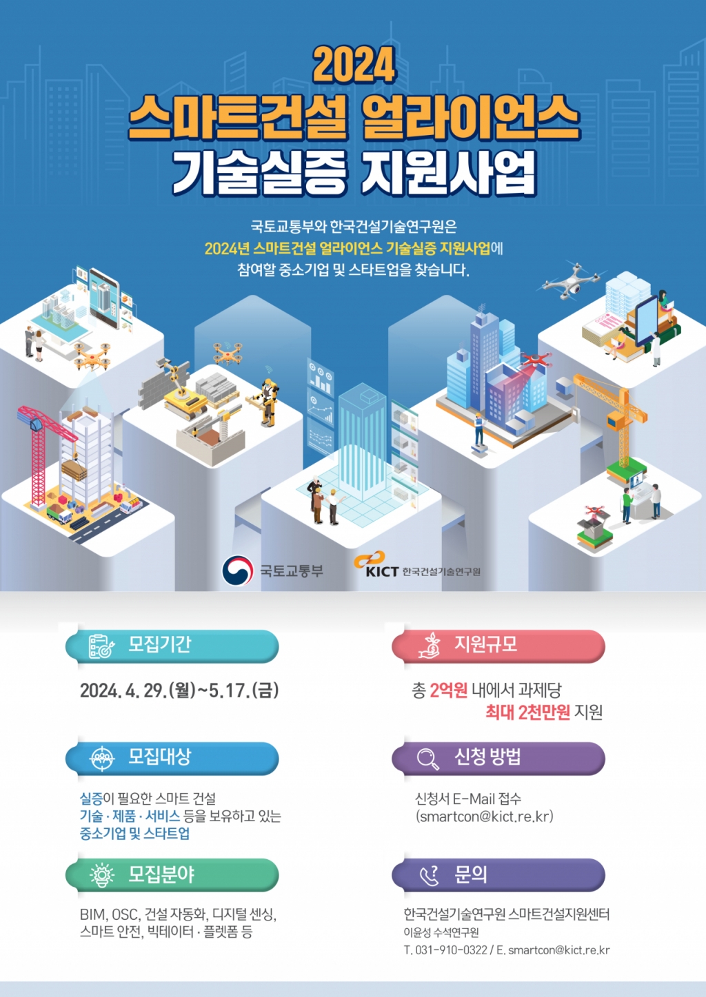 스타트업, 중소기업 등 관련 기술을 보유한 기업이 대·중견기업의 건설 현장에서 실시하는 기술실증 비용을 최대 2천만원까지 총 10개 내외의 사업을 선정하여 지원한다.