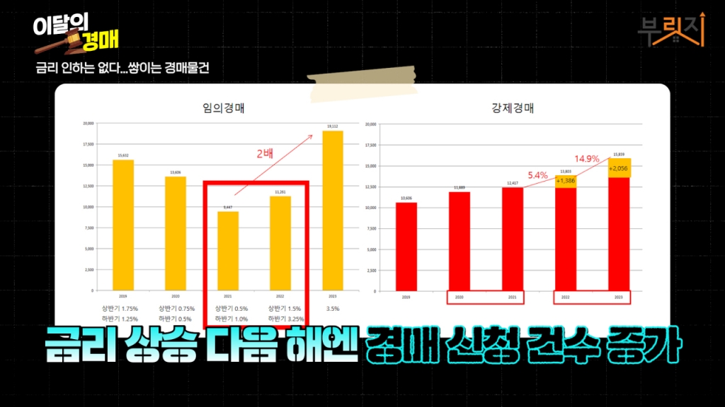 맞습니다. 제가 2019년부터 2023년까지 이거는 이제 법원 등기 정보 광장에서 제공하는 자료고요. 그랬더니 2019년도에는 상반기 때는 기준금리가 1.75%였는데 하반기 때는 1.25%로 줄어들었잖아요. 그러니까 이렇게 금리가 줄어들면 아무래도 이제 이자 부담은 덜 해서 그다음 연도에 경매 신청 건수는 줄어드는 모습을 볼 수가 있었고, 2023년도에는 경매 임의경매 신청 건수가 약 2만 건 정도 됐고요. 2021년도에는 한 1만 건 정도 했거든요. 그러니까 2배 가까이 증가한 모습을 볼 수가 있습니다.