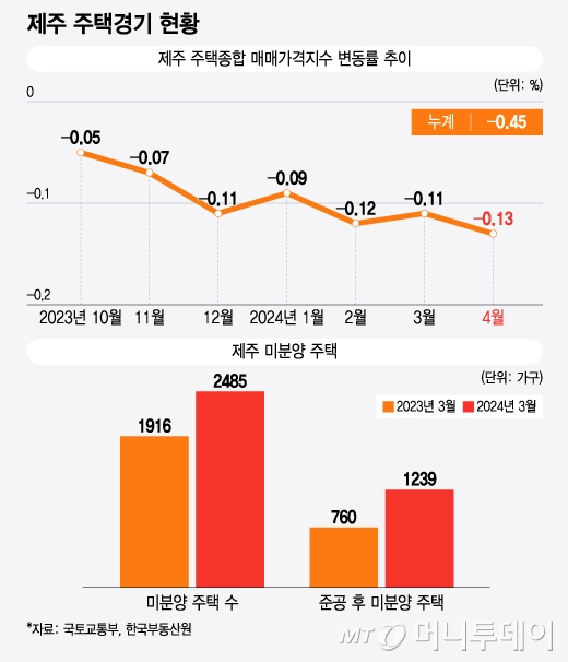 주택 가격은 하락하고 미분양 주택은 끊임없이 쌓이고 있다. 국토교통부에 따르면 지난 3월 기준 제주 미분양 주택은 2485가구에 이른다. 1년 전(1916가구)과 비교해서 29.7% 증가했다. 악성 미분양으로 불리는 준공 후 미분양 주택이 전체 미분양 주택에 49.9%(1239가구)에 이른다.