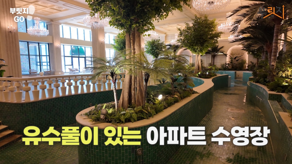 식사 후 커뮤니티 시설을 둘러봤는데요. 부릿지 제작진을 가장 사로잡은 시설은 이 수영장입니다. 아파트 수영장에 유수풀이 있더라고요. 여러 아파트 수영장을 가봤지만 이런 공간은 처음이었어요.