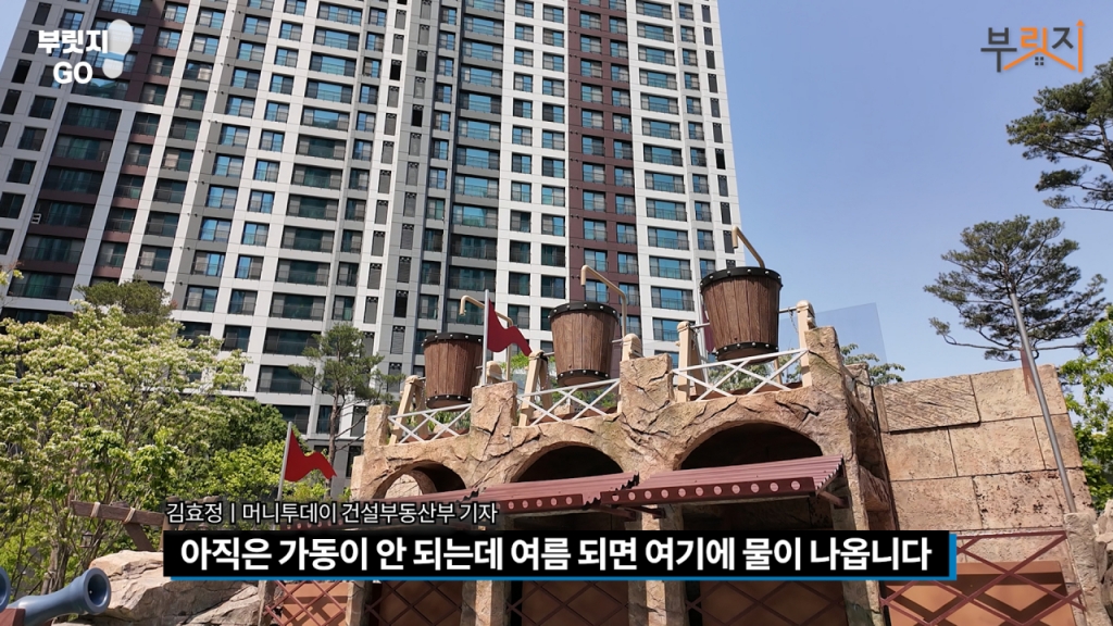 이 리조트 아파트의 자랑이죠. 워터파크에 가면 물 떨어지는 워터바스켓이라고 하나요? 물이 이렇게 시간을 두고 차면 떨어지는 건데 그 시설을 따라한 미니 워터파크가 여기에 있습니다. 아직은 가동이 안 되는데 여름 되면 여기서 물이 나옵니다. 물이 차면 이렇게 떨어지는, 워터파크처럼 아이들이 이용할 수 있게 운영이 된다고 해요.
