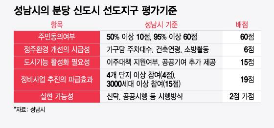 9일 정비업계와 성남시 등에 따르면 성남시는 주민동의율을 산정할때 상가 소유주의 동의 여부를 뺀 분당 선도지구 공모지침을 제시했다. 또 주민동의율 다음으로 배점이 높은 주택단지·세대수 점수에서도 4개 단지 이상 4점, 3000세대 이상 15점으로 세대수에 더 가점을 줬다. 도시기능 활성화 필요성 항목도 15점으로 국토부 가이드라인보다 5점 높였다.