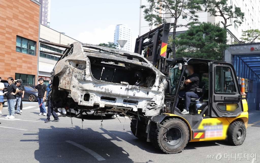 ![[인천=뉴시스] 김동영 기자 = 5일 오후 인천 서구 청라동 한 아파트 지하주차장에서 화재가 발생해 전소된 벤츠 전기차가 지게차로 옮겨지고 있다. 이날 경찰은 국립과학수사연구원과 함께 합동감식을 벌였다. 2024.08.05. dy0121@newsis.com /사진=김동영](https://thumb.mt.co.kr/cdn-cgi/image/f=avif/21/2024/08/2024080611303320213_1.jpg)