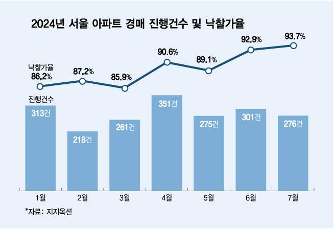 서울 아파트 경매 낙찰가율은 더 가파르게 상승하고 있다. 지난달 낙찰가율은 93.7%로 전달(92.9%)보다 0.8%p 올랐다. 2022년 8월(93.7%) 이후 1년 11개월 만의 최고치다.