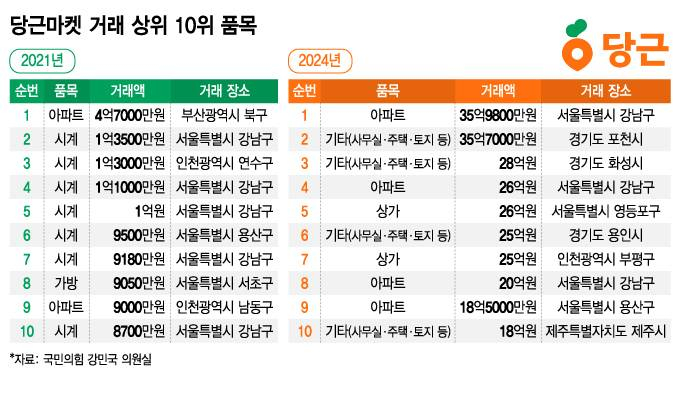 실제 당근마켓을 통한 부동산 거래는 매년 늘고 있다. 강민국 국민의힘 의원실이 공개한 자료에 따르면 2021년 당근마켓 거래 거래가격 상위 품목 10개 중 부동산은 2건이었다. 그러나 2022년부터 올해 7월까지 거래 가격 상위 10개 품목은 모두 부동산이었다. 올해 최고 금액에 거래된 물건은 올해 35억9800만원에 거래된 강남구 논현동 '브라이튼N' 아파트다.