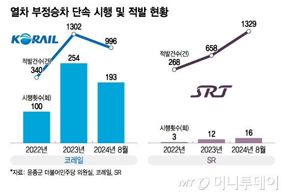 3일 국회 국토교통위원회 소속 윤종군 더불어민주당 의원실에 한국철도공사(코레일)와 에스알(SR)이 제출한 부정승차 단속 현황에 따르면 코레일은 지난해 1302건, SR은 658건의 부정승차를 적발했다. 올해 8월 기준으로 코레일은 996건, SR은 1329건을 적발한 만큼 올해는 더 늘어날 전망이다.