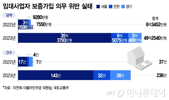 6일 국회 국토교통위원회 소속 이연희 더불어민주당 의원실이 국토교통부로부터 제출받은 임대사업자의 보증가입 의무 위반 실태점검 결과에 따르면 지난해 위반 건수는 236건, 액수는 49억2540만원으로 집계됐다.