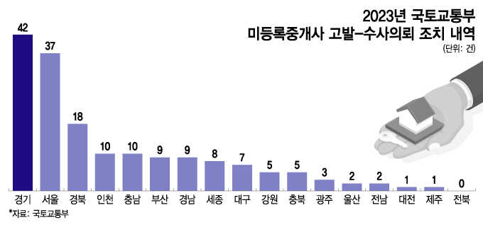 하지만 무등록 중개 관리·감독은 사실상 이뤄지지 않고 있다. 국토교통부에서 입수한 지난해 '공인중개사무소 개설등록을 하지 않고 중개업을 하는 미등록중개사를 고발·수사의뢰 등 조치한 내역' 자료에 따르면, 조치내역은 지난해 전국을 모두 합쳐 169건에 그친다. 지역별로 △경기 42건 △서울 37건 △경북 18건 △인천 10건 △충남 10건 △부산 9건 △경남 9건 △세종 8건 △대구 7건 △강원 5건 △충북 5건 △광주 3건 △울산 2건 △전남 2건 △대전 1건 △제주 1건에 그쳤다. 전북에선 조치내역이 전무했다. 올해에도 상황은 크게 달라지지 않았다.