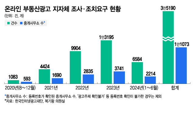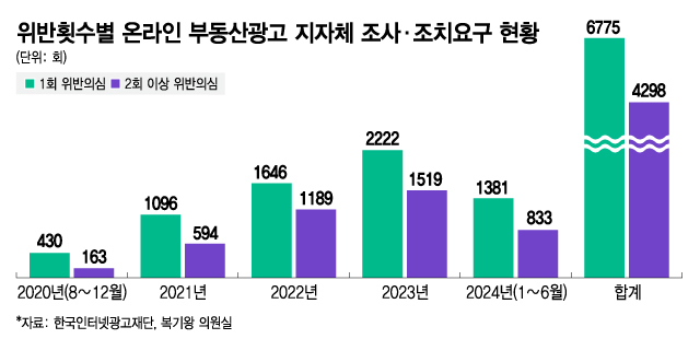 온라인 부동산 광고 게시물을 올리면서 공인중개사법을 위반한 중개사무소 수는 △2021년 1690개 △2022년 2835개 △2023년 3741개로 매년 증가했다. 올해 들어서도 6월까지 반년동안 2214개 중개사무소가 적발됐다.