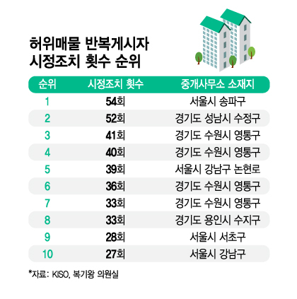 민간단체의 '솜방망이 처분'으로 실효성이 떨어진다는 지적이 나오는 이유다. 그 결과 규제를 두려워하지 않는 '재범'이 늘고 있다. 불량매물을 반복적으로 홍보해 '2회 이상 위반의심' 건으로 지자체에 통보되는 건은 △2021년 594건 △2022년 1189건 △지난해 1519건으로 상승세가 가파르다. KISO와 한국프롭테크포럼이 각각 파악한 허위매물 최다 반복 게시자는 각각 54회, 35회에 달하는 시정조치(게시물 차단 등)를 받았을 정도다.