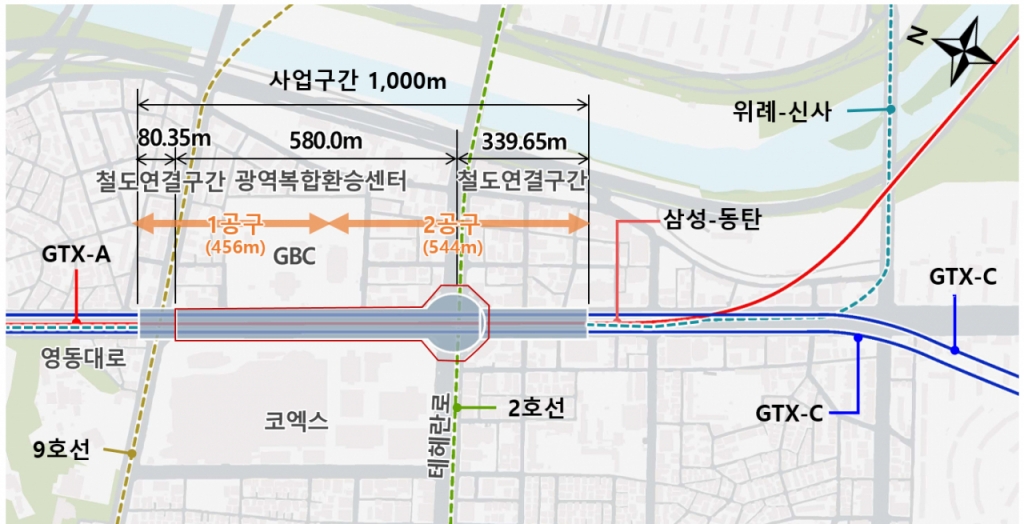 영동대로 지하공간 복합개발 건설공사는 국제교류 복합지구 내 대중교통 등 기반시설과 시민 편의시설을 확충하기 위해 진행되는 사업이다. 철도·버스를 기반으로 하는 첨단 환승시스템을 구축, 스마트 기술이 적용된 미래형 대중교통 허브가 탄생할 예정이다. 특히 삼성~동탄 광역급행철도, 수도권 광역급행철도 GTX-A․C, 위례신사선 경전철, 지하철 2호선(삼성역), 9호선(봉은사역) 등이 연계돼 강남을 중심으로 수도권 곳곳을 잇는 체계적인 철도 시스템이 마련될 전망이다.