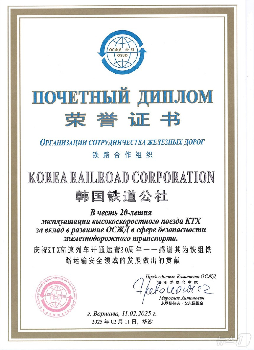 OSJD는 유라시아 철도의 국제표준을 수립하는 국제기구다. 코레일은 2004년 KTX 개통 후 10억명이 넘는 승객을 싣고 달리며 정시율과 사고건수 등 주요 안전 지표에서 글로벌 최상위 수준을 유지한 성과를 인정받았다.