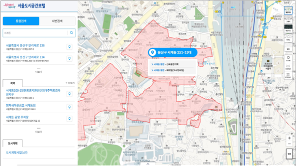 이용자는 도시계획 사업유형별, 자치구별, 진행단계별 등의 조건으로 검색하고, 통계지도에서 클릭 한 번으로 사업 정보를 볼 수 있다.