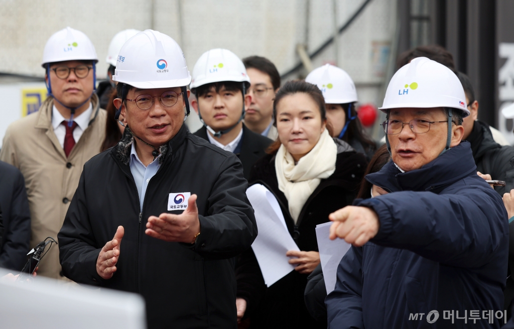 ![[서울=뉴시스] 홍효식 기자 = 박상우(왼쪽) 국토교통부 장관이 5일 서울 은평구 응암동 소재 신축매입임대 주택공급 현장을 방문해 이한준 한국토지주택공사(LH) 사장과 평면도를 살펴보고 있다. 이날 방문한 주택은 신혼부부 및 신생아 가구를 대상으로 공급할 예정이며, 20층 높이로 아파트 60가구에 오피스텔 12호로 지어진다. 시세 대비 저렴한 임대료로 6년 간 살아보고 분양여부를 선택할 수 있다. 2025.03.05. yesphoto@newsis.com /사진=홍효식](https://thumb.mt.co.kr/cdn-cgi/image/f=avif/21/2025/03/2025030511044929424_1.jpg)