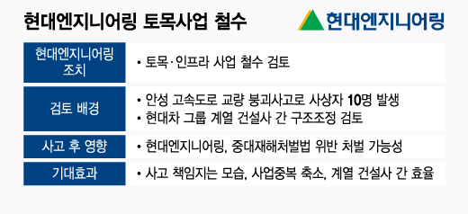 현대엔지니어링이 국내 토목·인프라 사업 철수를 검토한다. 사상자가 다수 발생한 경기도 안성 '서울세종고속도로' 교량 붕괴사고 이후 내린 특단의 조치다. 현대자동차 그룹이 건설 계열사 리스크 관리 차원에서 본격 구조조정에 돌입했다는 분석이다.