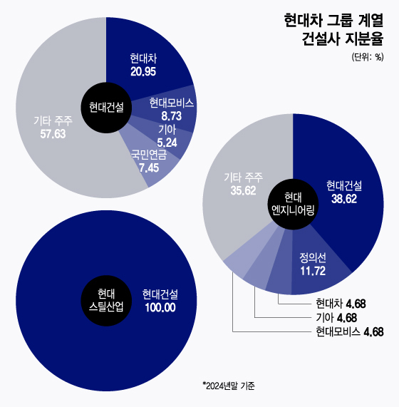 현대차그룹 내 건설 계열사들이 구조조정 대상이다. '맏형' 격인 현대건설(151,100원 ▲2,300 +1.55%)은 그룹 내 건설 부문을 대표하는 주력 회사다. 현대엔지니어링과 현대스틸산업은 현대건설의 자회사다. 현대건설 최대주주는 지분 20.95%를 보유한 현대차(471,000원 ▲5,500 +1.18%)다. 모비스(4,375원 ▲120 +2.82%)(8.73%), 국민연금공단(7.45%), 기아(5.24%) 등이 현대건설 주요주주다. 현대엔지니어링의 최대주주는 현대건설로 지분 38.62%를 보유했다. 정의선 현대차그룹 회장이 11.72%를 보유한 2대 주주다. 현대스틸산업은 현대건설의 100% 자회사다.