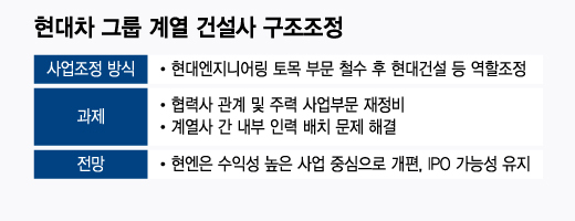 다만 그룹 차원의 사업 조정이 법적 문제에 맞닥뜨릴 가능성도 고려해야 한다. 공정거래위원회의 기업결합심사 관문을 넘어야 하기 때문에 법인 간 직접적인 합병보다는 사업 간 조정 형태로 구조조정이 진행될 가능성이 높다. 현대엔지니어링의 토목 사업을 현대건설 등에 통째로 넘기기보다 사업 부문을 조정해 계열사 간 중복을 줄이는 방식이 유력한 것으로 알려졌다.