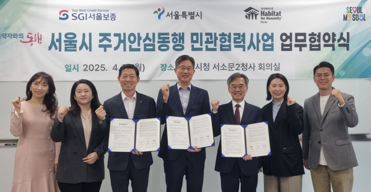 서울시는 지난 7일 오전 서울시청 서소문2청사에서 서울보증보험(주), 한국해비타트와 함께 '주거안심동행 민관협력사업' 업무협약을 체결했다고 8일 밝혔다. 협약식에는 최진석 서울시 주택실장, 심성보 서울보증보험(주) 경영수석부문장, 이광회 한국해비타트 사무총장이 참석했다.