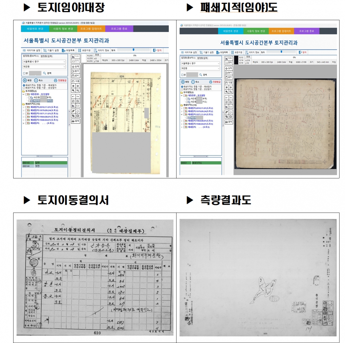 올해 서울기록원에 보관 중인 토지기록물 44만 건을 시작으로 내년까지 총 100만 건, 2030년까지 200만 건에 대한 디지털화할 계획이다. 앞서 시는 2022년 흑백(저해상도)으로 저장돼 식별이 어려웠던 33만 건의 자료를 고화질 컬러로 개선하기도 했다.