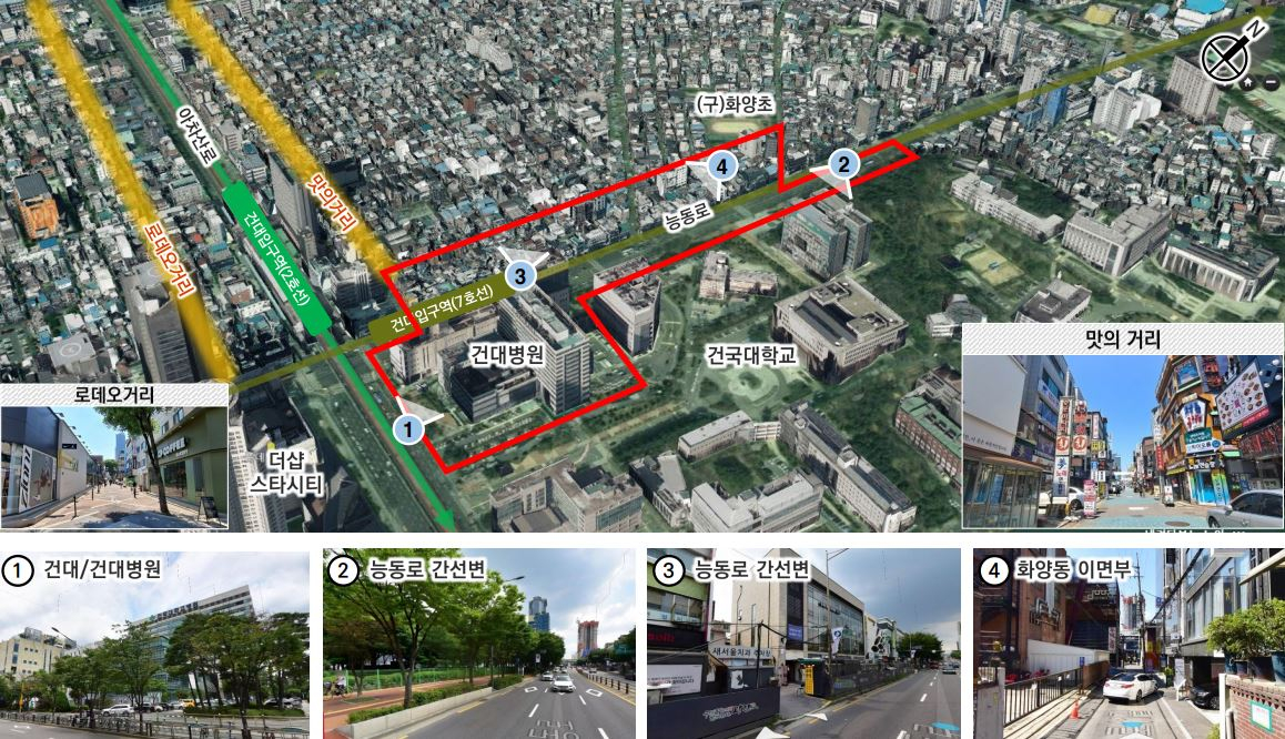 지구단위계획 대상지는 화양동 3-1번지 일대로 7만6255㎡ 면적에 준주거지역과 제3종일반주거지역이 섞여 있다. 근린생활시설 중심으로 소규모 노후 저층 건축물이 많다.