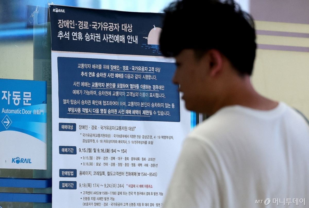 ![[대구=뉴시스] 이무열 기자 = 15일 대구 동구 동대구역 대합실에 2025년 추석 연휴 승차권 예매 안내문이 붙어 있다, 코레일은 15~16일 오전 9시~오후3시 교통약자·국가유공자, 17~18일 오전 7시~오후1시 전 국민을 대상으로 추석 연휴 승차권 예매를 시작하며 10월 2일부터 12일까지의 열차 승차권을 예매할 수 있다. 코레일톡 어플리케이션과 홈페이지 등을 통해 예매가 가능며 기차역 창구 현장 예매는 진행하지 않는다. 2025.09.15. lmy@newsis.com /사진=이무열](https://thumb.mt.co.kr/cdn-cgi/image/f=avif/21/2025/09/2025091710543377607_1.jpg)