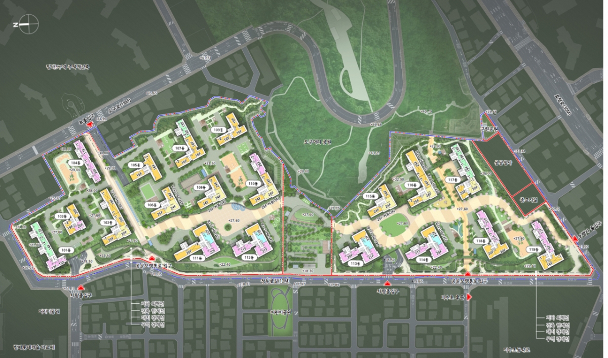 단지 중앙부에는 대규모 공원이 조성돼 주민 휴식공간으로 활용된다. 공원과 공공보행통로를 통해 인근 도구머리공원과 연결되는 녹지축을 확보하고, 주변 지형에 순응하는 통경축도 마련한다. 청두곳길 가로변에는 근린생활시설·공유 커뮤니티시설·휴게쉼터 등을 배치해 지역주민에게 열린 가로 환경을 조성할 계획이다.