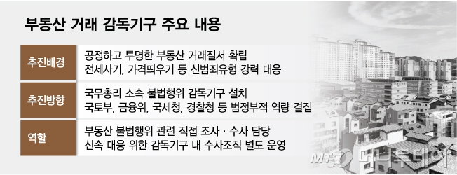 '부동산 불법행위 감독기구'는 국무총리 소속으로 설치해 범정부적으로 운영한다. 감독기구는 기존 부동산 불법행위 조사·수사의 기획·조정 외에도 산하에 수사조직을 운영해 직접 조사·수사까지 담당한다. 정부는 부동산감독추진단을 운영해 전담기구 설립을 준비하고 관련법률 제·개정 역시 추진한다.