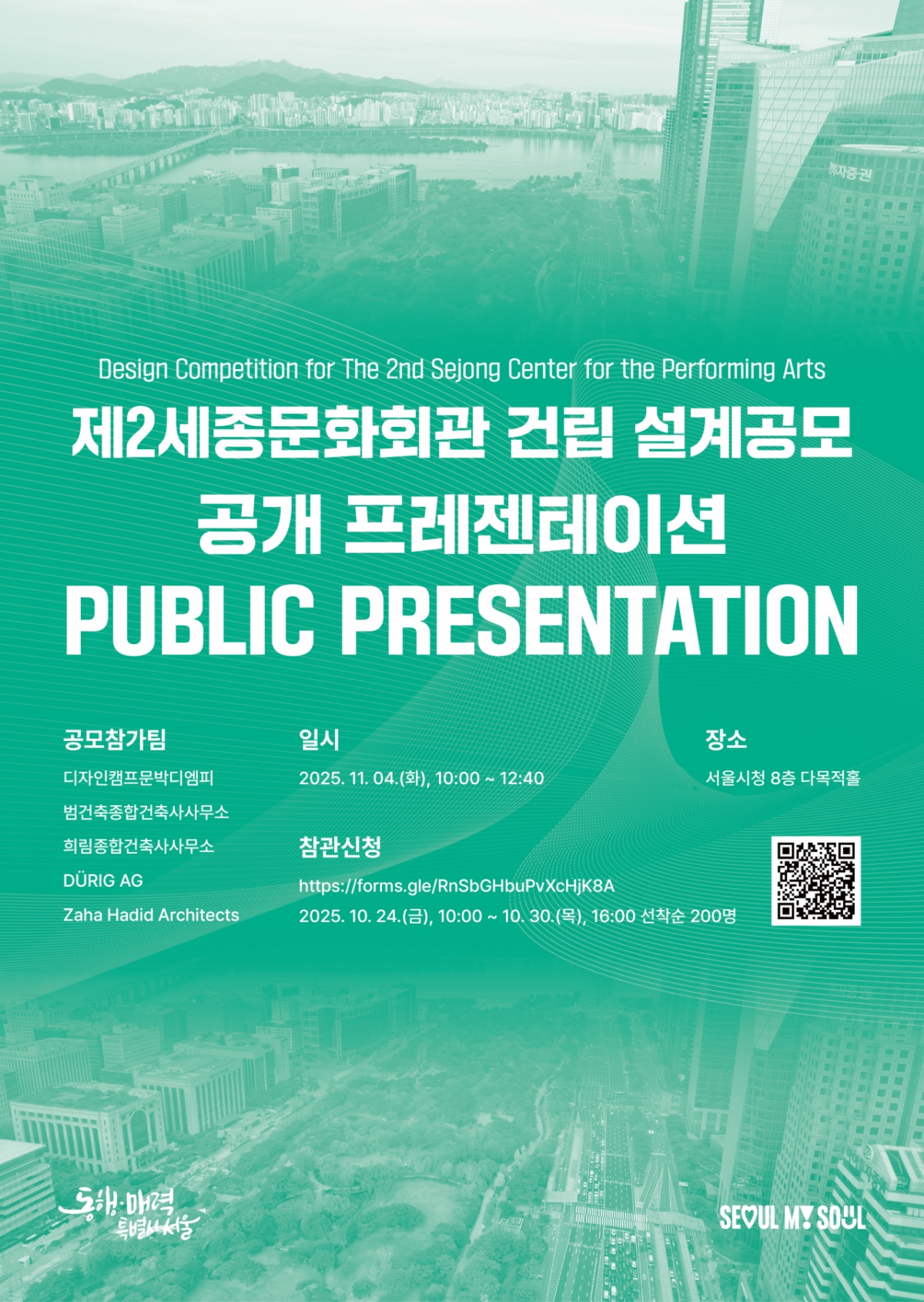 공개 프레젠테이션 참관을 희망하는 경우, 오는 24일부터 30일까지 서울시 설계공모 홈페이지 '프로젝트 서울'을 통해 신청할 수 있다. 현장에 참석하지 못하는 시민들도 유튜브 중계를 통해 실시간으로 시청할 수 있다.