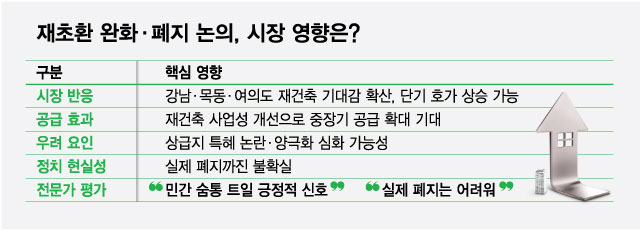 재초환 완화·폐지 논의는 정부 공급정책이 공공 주도에서 민간 주도로 전환되는 신호가 될 수 있다. 하지만 동시에 강남 등 상급지 집값 급등, 특혜 논란, 입법 불확실성, 단기 시장 과열 등의 위험도 안고 있다.