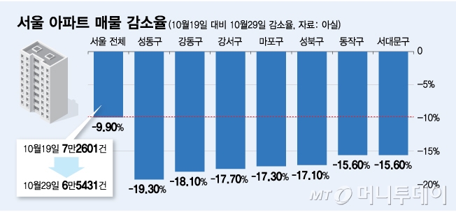 29일 부동산 빅데이터 플랫폼 아실에 따르면 서울 전체 아파트 매물은 서울 전역이 토허제로 지정되기 직전인 지난 19일 7만2601건에서 이날 6만5431건으로 9.9%(7170건) 감소했다. 특히 성동구는 매매매물이 1566건에서 1264건으로 19.3% 급감하며 감소율이 가장 컸다. 이어 △강동구(-18.1%) △강서구(-17.7%) △마포구(-17.3%) △성북구(-17.1%) △동작구(-15.6%) △서대문구(-15.6%) 등의 매물이 15% 이상 줄었다. 모두 신규로 토지거래허가구역(이하 토허구역)으로 지정된 곳이다.