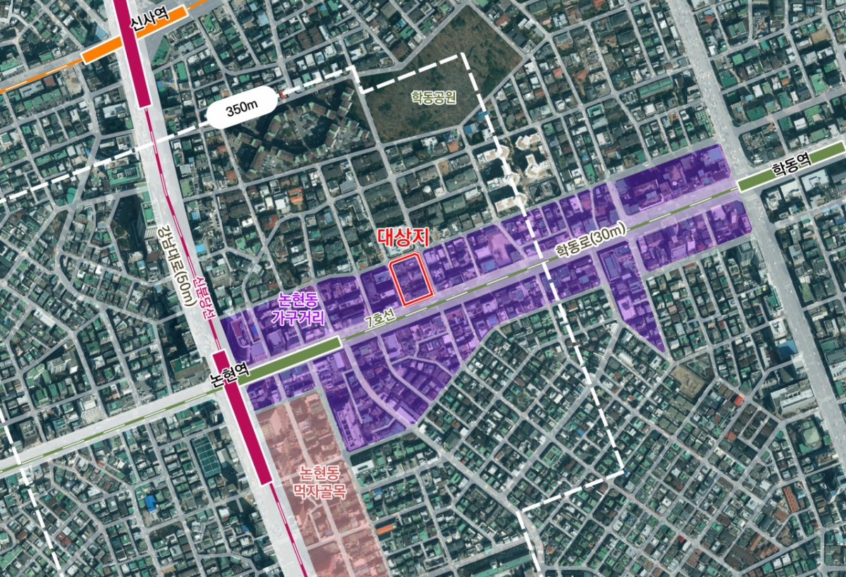 대상지는 논현역 역세권인 논현 가구거리 일대다. 업무 기능이 지역의 수요를 따라가지 못하고, 이면부 저층 주거지 밀집 지역의 휴게공간 부족 등 도시 기능을 회복을 위해 정비가 필요한 지역이다.