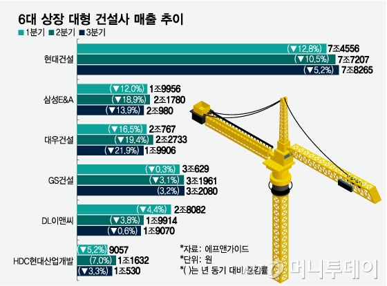 12일 건설업계에 따르면 최근 대형 건설사들은 지난 3분기 실적 발표를 마무리 했다. 올 한 해 보수적인 수주 기조가 이어지는 가운데 매출 감소가 눈에 띈다. 6개 대형 상장건설사(현대건설(142,100원 ▼6,300 -4.25%), 삼성E&A(35,700원 ▲2,450 +7.37%), 대우건설(15,550원 ▼1,790 -10.32%), GS건설(25,100원 ▼750 -2.9%), DL이앤씨(66,800원 ▼2,400 -3.47%), HDC현대산업개발(20,450원 ▼1,000 -4.66%)) 중 GS건설을 제외한 5개사는 정도는 다르지만 전년 동기 대비 매출이 감소했다.
