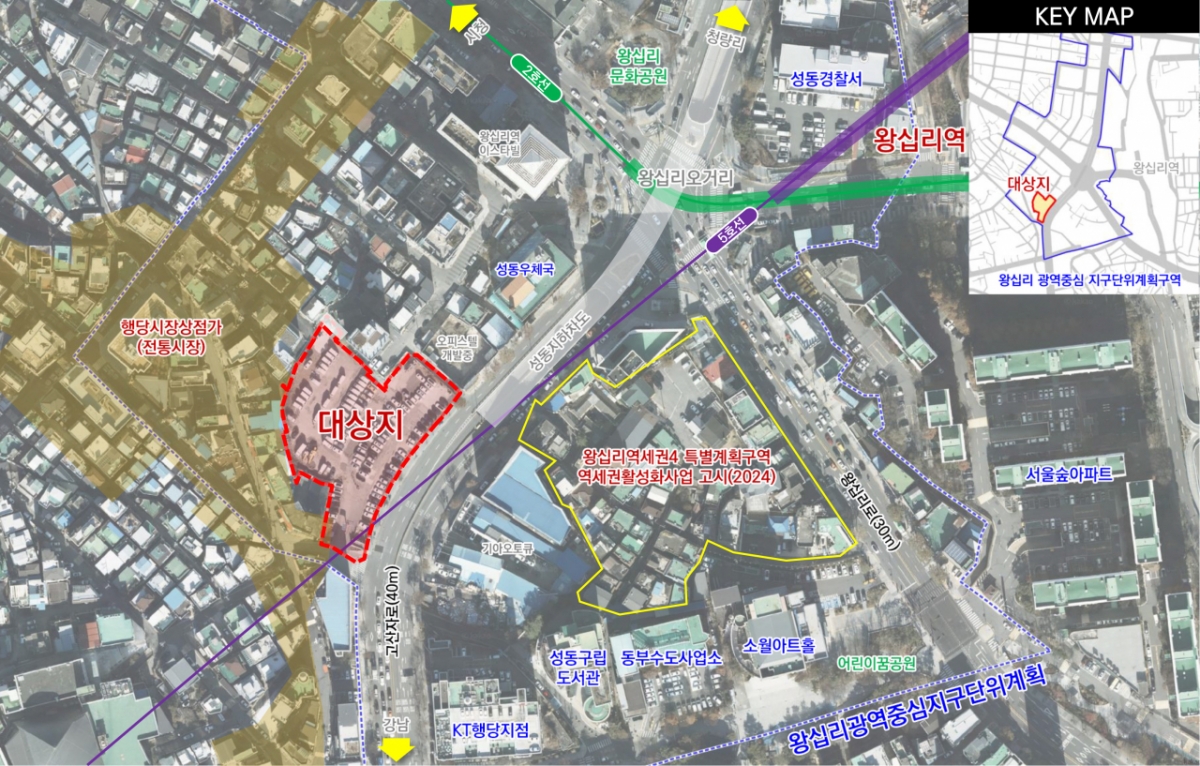대상지는 6개 노선이 교차하는 광역 접근성이 매우 우수한 고차 역세권이다. 서울 동북권의 핵심 요충지인 왕십리 광역거점에 자리했다. 주변에는 성동구청과 구의회, 성동경찰서 등 주요 공공기관이 밀집해 공공업무 및 상업·문화 기능이 집중된 지역이다. 현재는 주차장 부지로 이용되고 있다.