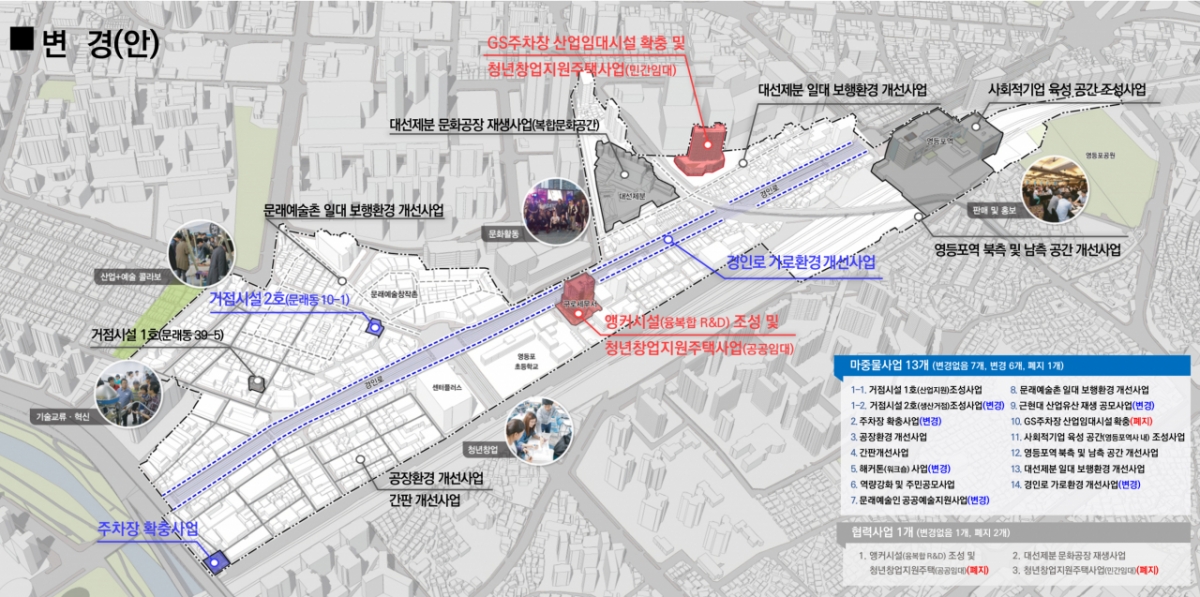 2018년부터 추진해 왔던 영등포 경인로 일대 도시재생사업은 올해 12월 마무리된다. 사업 추진 과정에서 정책 및 여건 변화 등으로 당초 14개 마중물 사업, 3개 협력 사업(지자체 1개, 민간 2개)은 13개 마중물 사업, 1개 협력 사업(민간 1개)으로 바뀌었다. 김창규 서울시 균형발전본부장은 "이번 도시재생활성화계획 변경은 도시재생전략계획 변경에 따라 사업계획을 변경하고 주민 체감도 높은 사업 중심으로 재정비하기 위한 절차라는 점에 의의가 있다"며 "영등포 경인로 일대 도시재생사업을 시작으로 개발과 보존이 균형을 이룬 도심 거점지역으로의 발전이 기대된다"고 말했다.