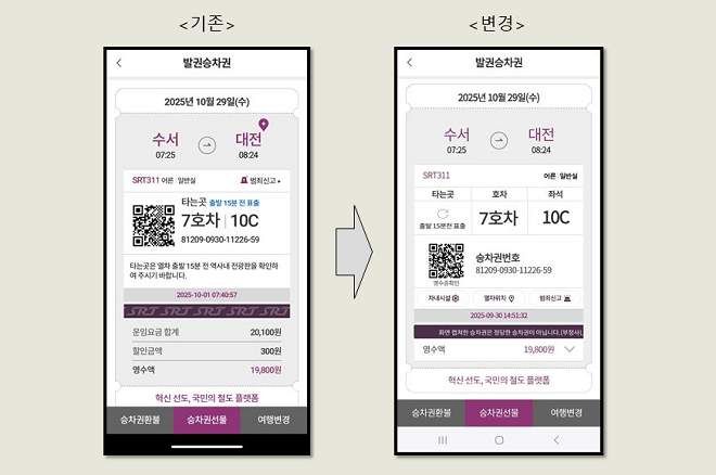 또 차내시설 정보 등의 버튼을 하단에 배치해 이용자의 조작 편의성도 높였다. 색상 대비와 글자 크기도 조정해 주요 정보가 한눈에 들어오도록 했다. 아울러 QR코드 영역과 승차권 번호 영역도 명확히 분리해 검표 시 인식률과 화면 가독성을 동시에 개선했다.