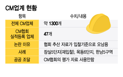 재건축·재개발 등 정비사업 조합들이 공사 전 과정을 관리하는 CM업체 선정기준으로 특정 협회의 평가자료를 활용중인 것으로 확인됐다. 전체 1300여개 CM업체 중 해당 협회에 실적신고를 한 업체는 47개 뿐이다. 대표성이 부족한 선정기준이 적용되면서 우량 업체를 포함한 대다수가 입찰에서 사실상 배제되고 있다는 지적이 제기된다.