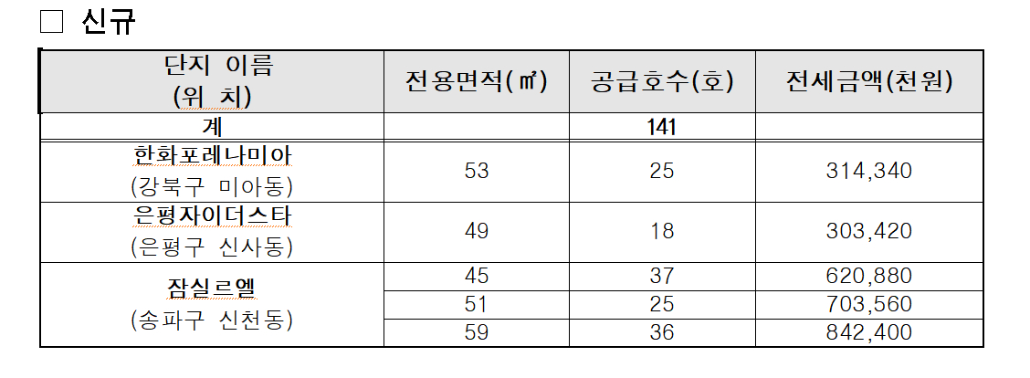 서울시는 신천, 미아 등 서울 전역 71개 단지에서 '제6차 미리내집(장기전세주택Ⅱ)'의 400가구 입주자 모집을 공고한다고 27일 밝혔다. 신청 기간은 다음 달 10일부터 사흘간이다. 이번 공급은 신천동(송파), 미아동(강북) 등 생활과 교통이 편리한 신규 단지 및 재공급 단지로 전용면적 41㎡부터 84㎡까지다. 전세금은 최저 2억6000만원(구로구 호반써밋 개봉 59㎡)부터 최고 8억9000만원(서초구 서초푸르지오써밋 59㎡)까지다.