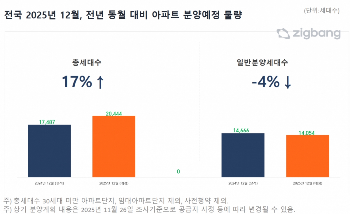 1일 부동산 플랫폼 직방에 따르면 올해 12월 전국 아파트 분양 예정 물량은 총 2만444가구로, 전년 동월(1만7487가구)보다 17% 증가했다. 다만 최근 3년(2022~2024년) 예년 평균 물량(2만3256가구)과 비교하면 12%가량 적은 수준이다.