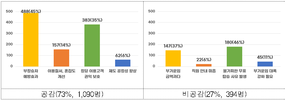 공감 이유로는 '부정승차 예방 효과'가 45%로 가장 많았다. '정당한 이용 고객의 권익 보호'가 35%로 뒤를 이었다. SRT 이용객들이 부정승차를 개인의 일탈을 넘어 다수 이용자의 불편과 피해로 인식하고 있다는 의미로 해석된다.