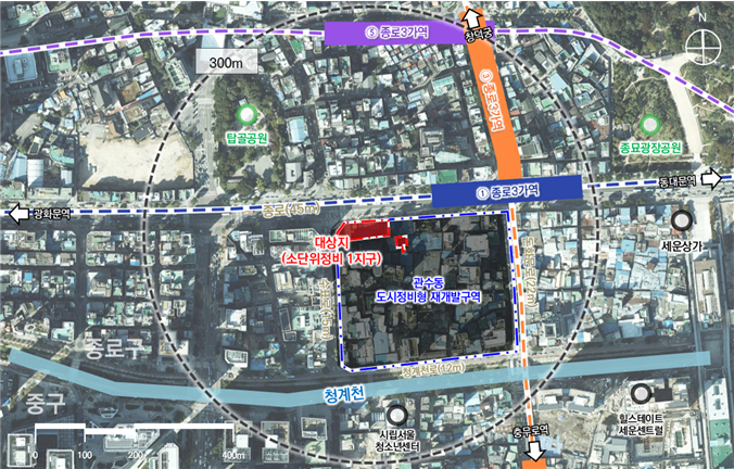 관수동구역은 탑골공원과 종로3가역, 청계천 사이에 위치한 지역으로 저층의 노후·불량 건축물과 화재에 취약한 목구조 건축물이 밀집해 조속한 정비 필요성이 제기돼 왔다.