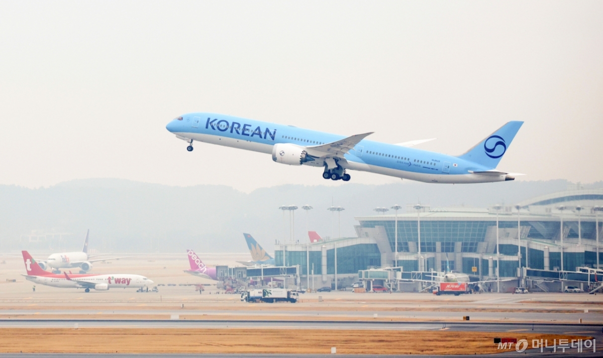 ![[인천공항=뉴시스] 김선웅 기자 = 대한항공 새 CI 적용 항공기 KE703이 12일 인천국제공항에서 이륙하고 있다. 아시아나항공과의 통합 출범에 나서는 대한항공은 한국을 대표하는 통합 항공사임을 강조하기 위해 고유의 태극마크를 현대적 이미지로 구현한 CI(Corporate Identity)를 41년 만에 교체했다. 2025.03.12. mangusta@newsis.com /사진=김선웅](https://thumb.mt.co.kr/cdn-cgi/image/f=avif/21/2025/12/2025121008503648896_1.jpg)