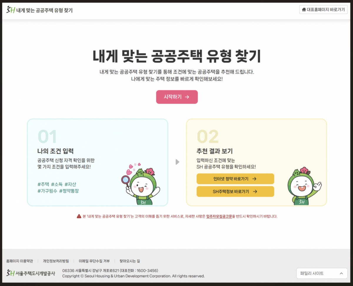 10일 SH에 따르면 해당 서비스는 무주택 여부, 세대 구성, 소득, 자산 등 몇 가지 핵심 자격 요건만 입력하면 신청 가능한 주택 유형을 자동으로 추천해준다. 그동안 공공주택은 다양한 유형이 있어 자격 요건이 복잡하지만, 시민들이 이를 스스로 확인할 수 있는 수단은 충분하지 않았다는 불편이 있었다.